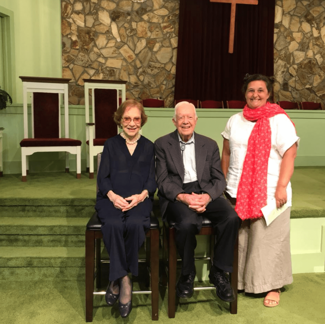 Jan, George’s wife announced that she was a fourth grade teacher and she had worked with the Secret Service when Amy was in her class and that we needed to listen. I immediately loved her. Southern accent, commanding voice, no nonsense shoes, short hair cut. She reminded me of my mom or Cathy Lawson and other moms of the 80s- who didn’t know what botox was, could care less about premature gray hair and told their children on Friday afternoons to not come in the house because the moms were doing puzzles, eating Cheezits and drinking wine. We lined up as instructed and I realized I was the 112th car not person. Jan said numbers under 40-50 would get in the pews and the rest of us would be in overflow. Our line wound around the church as the Secret Service “wanded” us. We laid our number in the basket and walked into the overflow room with the accordion doors squeezed shut. The folding chairs were packed in and barely aisles to walk. Jan and George want as many people to get to see Carter as possible.