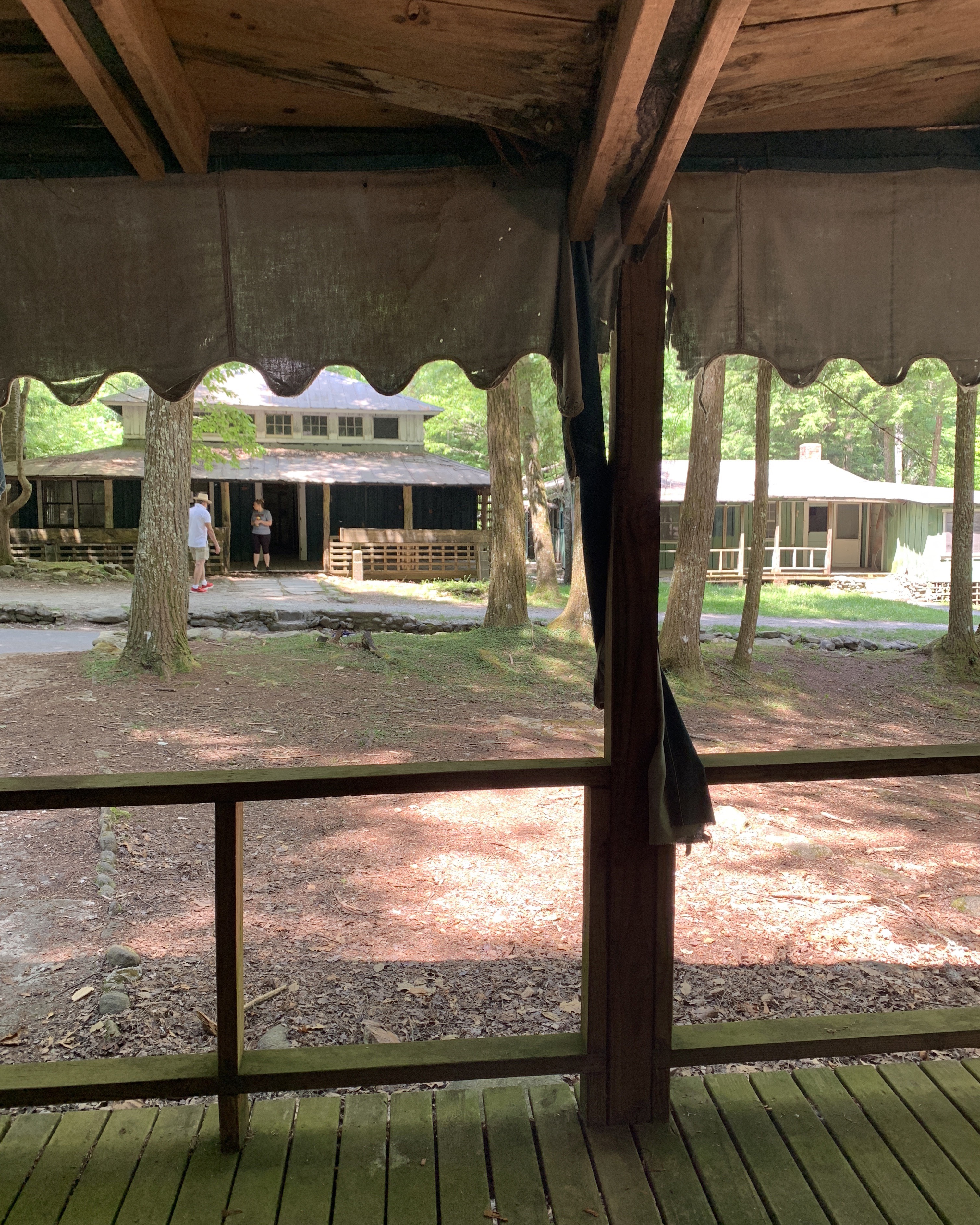 But Daisy Town was live in the flesh -well, more like a ghost town of the loveliest family cottages left to nature and now being rebuilt and repainted by the National Park Service just for walk throughs and looky loos like us, not for renting. We wandered into a dream, opening the extremely creaky screen doors and peeking in the clapboard rooms and linoleum floor additions next to the ancient bathrooms with claw foot tubs collecting leaves and spiders. I couldn’t go into the one with a low ceiling. It felt like the demons from my podcast in Wellesley Massachusetts might be vacationing in Daisy Town. The paint colors were dreamy the deep weathered blue was my favorite. Some of the windows still had the wavy glass and others were large bare peep holes to the thick forests. The old logging and vacation community was fought for and loved and wishful thinking wants it to survive but maybe it is best that it is cared for by the Parks. If you want to know more watch this docuseries from the NBS news in Knoxville TN from 2017, just click on the underlined words.