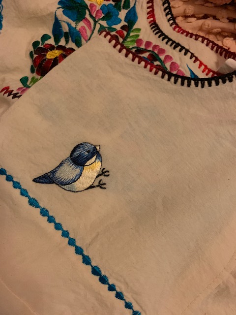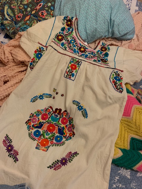 Last week Dolly had prepped her fanny pack with some of her patches and I was inspired and tonight I stitched and ironed on my patches to a beloved dress with a few tiny grease stains. The hardest part was threading the needle- and yes- I have on my granny glasses. When I was a little girl my mom burnt a hole in her nice khackis with her Now cigarettes. She sewed a little honey bee over the hole and I knew she was a genius and stylish.