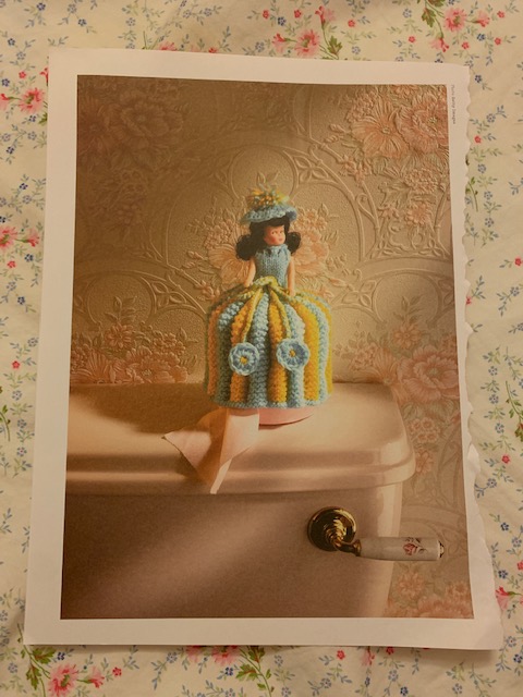 This picture I happened across while collaging- This. It just makes my heart sing. It floats my boat. It puts the sizzling tingle in my brain that makes me happy about the now and hopeful for the future. If this picture can exist… If this crochet toilet paper cover doll can exist in all it’s homemade glory… If this wallpaper could be chosen and applied behind this sweet pale pink toilet, maybe the world is OK after all. And if someone can recognize the beauty in this Southern Belle atop a commode next to flocked floral wallpaper then there are people like me in the world. I am not alone. Beauty exists and can still be discovered in the most unlikely places. And those places don’t have to be across the world or exotic destinations. These places housing beauty can be next door or even inside atop our commode.