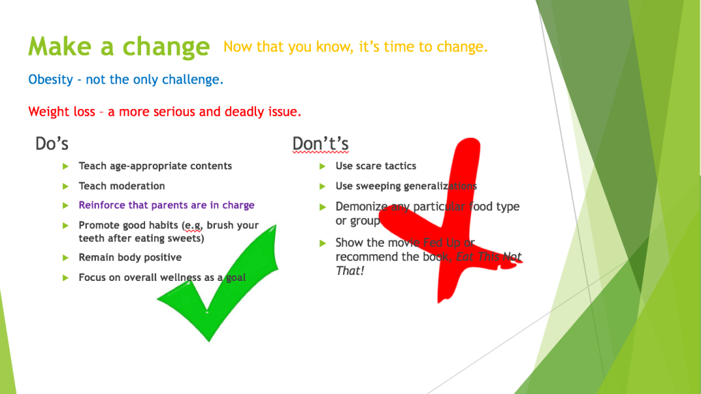 Sounds innocent enough unless you use evidenced based treatment of eating disorders and evidenced based treatment of childhood obesity. This isn’t science. Pledging to not eat villainized food groups increases eating disorder behaviors. Sounds like a feelpinion. I thought this was science class.