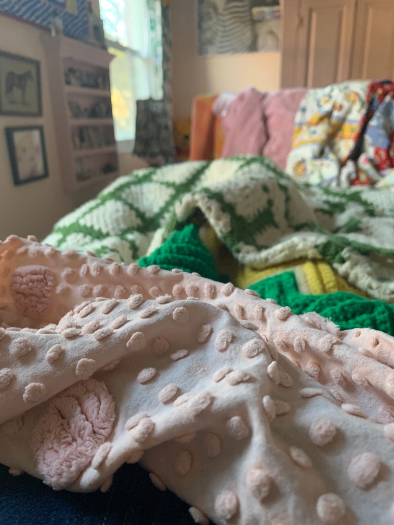 Through the rain. Past the desperate for attention dogs. I dashed back under my well loved peach chenille blanket. I bought this coverlet years ago at an estate sale. Two older ladies were selling their belongings in their drive way. I asked how much and one lady said fifteen dollars. I started to get my money out. The older woman stopped us and said to her friend, “I’m not sure I want to sell that.” It was lovely with peach pom poms hanging jauntily all around the edges and chenille polka dots covering the surface. The woman who had told me the price, took my money and told the other woman that the whole purpose of the sale was to get rid of stuff and we aren’t taking anything back inside. I sprinted back to my car before anyone fought me for my treasure.