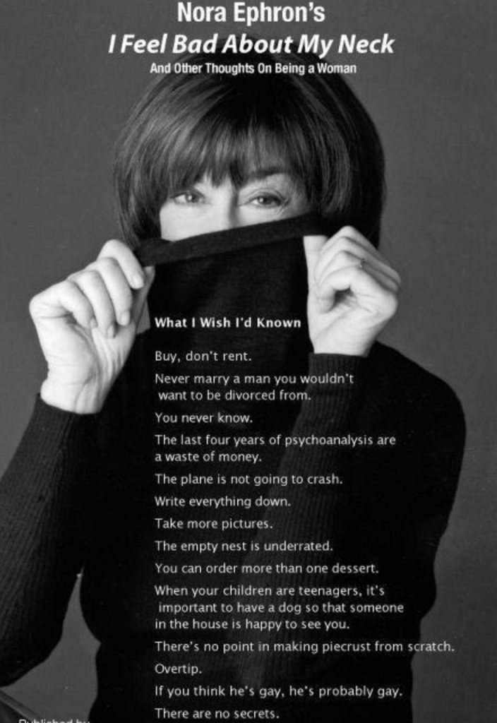 No one looks cute in bed with their head and shoulders propped up on pillows (I pronounce pillow “pella” so I do a double take when I try to spell it.) The way my head and neck curved forward so that my chin and my under chins become an upside landscape of hills and valleys. Oh Gawd. (How did Nora Ephron write a book about her neck? She was so thin.)