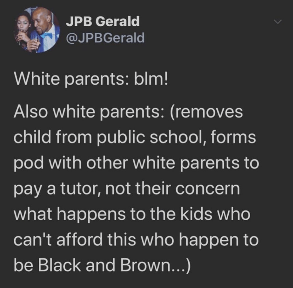 We just freaking protested! We just chanted for justice! Insisted on equality. We put black squares on our Instagram pages. And now what? What is your goal? What will your pod accomplish? What will your insistence on setting up enrichment for your own children do for the world?