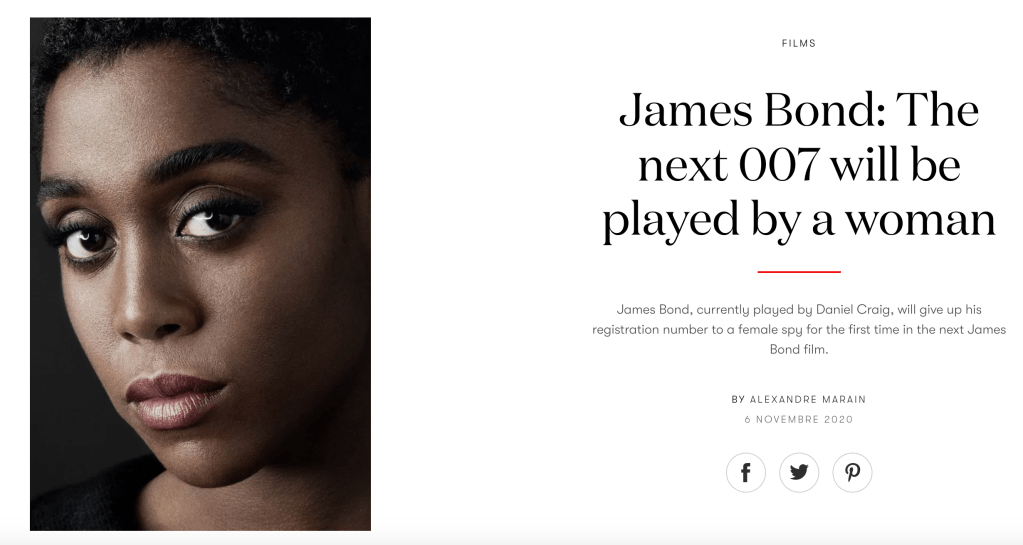 I saw the recent James Bond. He is dead. He is not coming back. The new Bond is female and black.
