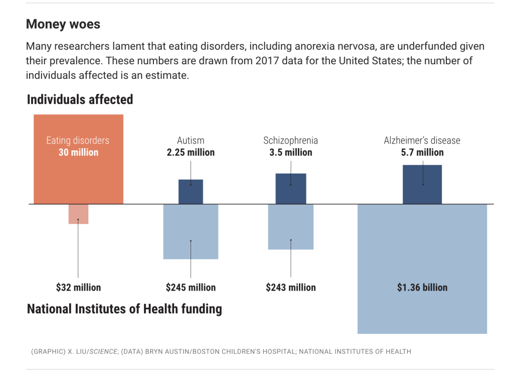 Scientists pursuing those new ideas face a challenge, in part because of money: For fiscal year 2019, anorexia got $11 million in funding from the National Institutes of Health (NIH), a figure that hasn’t changed notably in many years and that researchers decry as shockingly low given the disease’s burdens. By contrast, schizophrenia—which has a similar prevalence and also surges during adolescence—garnered $263 million. The dearth of funder interest, many say, springs from the view that anorexia’s roots are cultural, along with shame and stigma still clouding the disease. But evidence is mounting that biology is at its core.