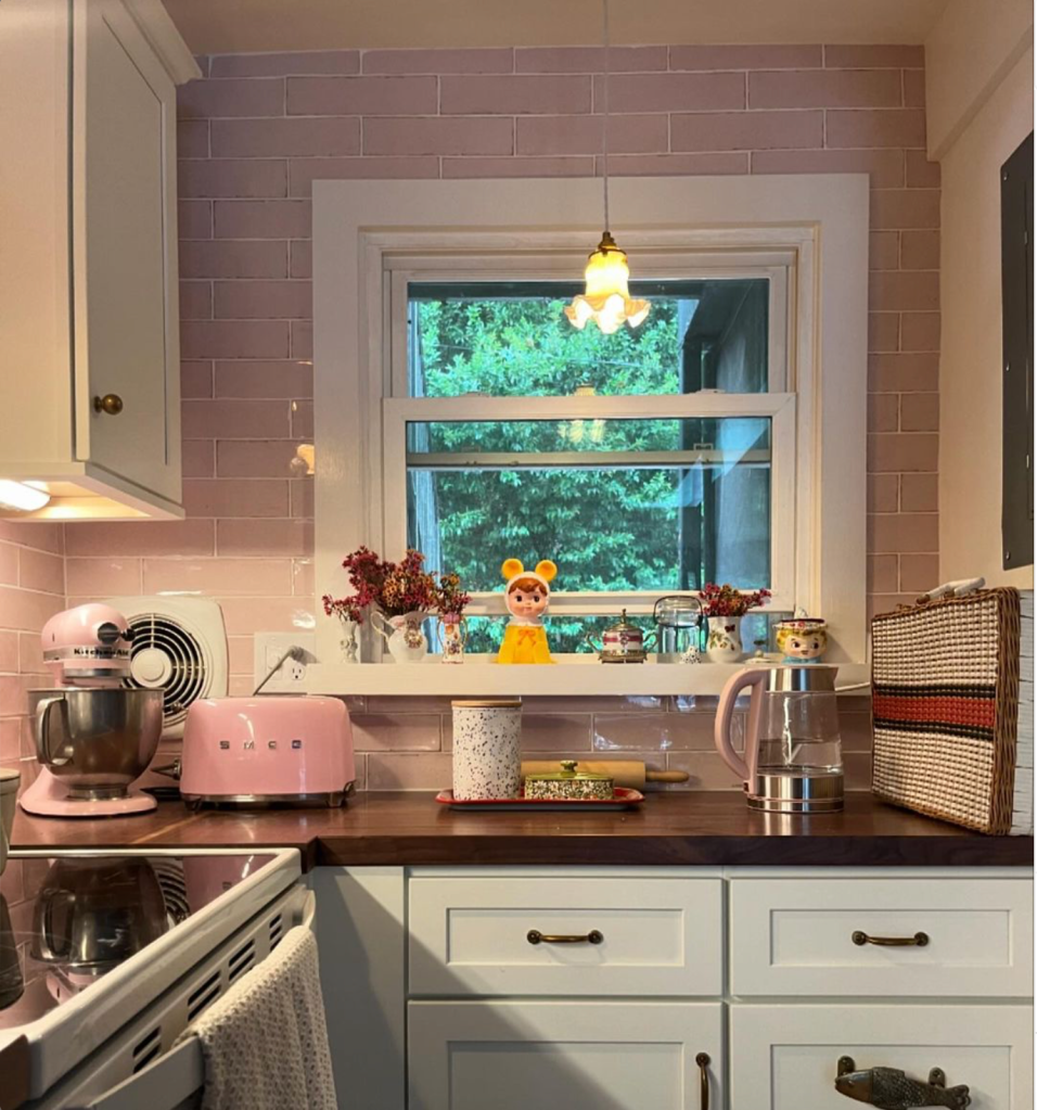 My world shrinks to driving distances accompanied by my constant companion. And who am I to not love my life? This life is beautiful whether in Atlanta or distant shores. So I redid my condo. Year 8 or 9 of the Ten Year Plan and I am living to the fullest. I avoid the phrase killing it because I want to move away from violent imagery even in my language. The walls are cloud wallpaper. The tile is pink subway. The light fixtures are a moth, a huge peppermint ball, and flowers. The bedroom Mim and I share is becoming our art gallery. Beauty, my passions and my own personal opinion is rampant in 14b these days. I mix patterns. I combine pink and red. Plastic tchotchkes, a collection of Virgin Marys and children’s books will gather dust and make me smile in contentment.